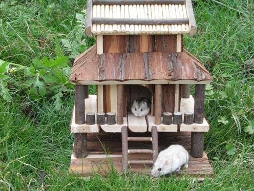 Пластмасовите къщички, които не могат да бъдат опустошени по този начин, се избягват в този случай. Подобни малки къщички изобщо не са подходящи при отглеждането на двойка хамстери или на малките, тъй като дори само гнездото изисква по-голямо пространство, а малките, които растат с всеки изминал ден, се нуждаят от повече простор за движение. За подобаващо и щадящо отглеждане на животните на всяка цена следва да купите само такава къщичка за сън, която е достатъчно голяма за нуждите на вашия хамстер. Ако не намерите на пазара подходяща готова къщичка, не бива да се тревожите, тъй като много лесно сами можете да направите къщичка за златист хамстер от дърво. Саморъчно направената къщичка може да е и малко по-голяма, но на същата добра цена и много здрава и устойчива.
