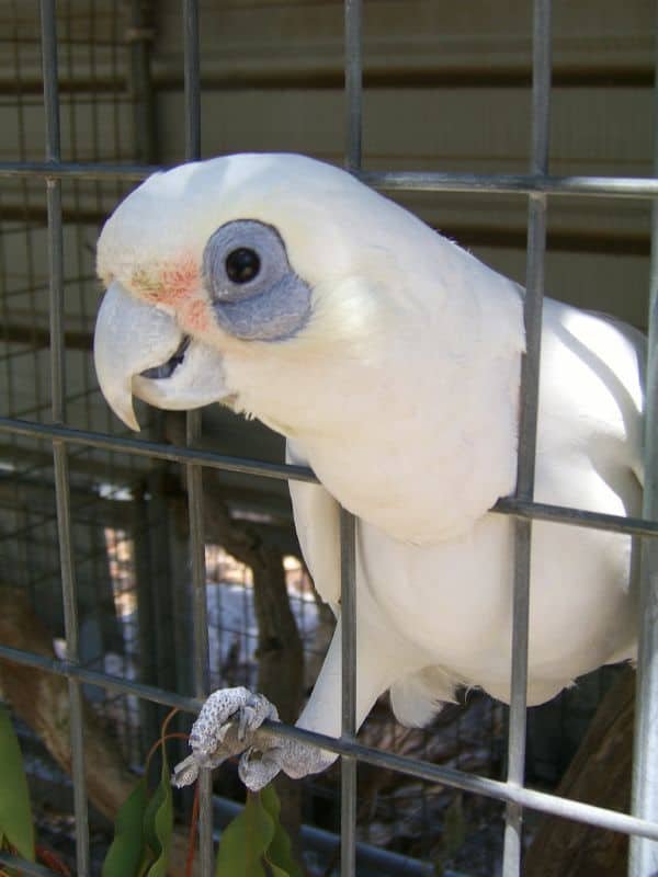 Голооко какадуОписание: Големина 38 см. Мъжки: Малко на брой червени пера между очите и клюна. По челото също се виждат няколко червени пера. Синьочерният оголен очен пръстен е разтегнат надолу. Перата по предната част на главата може да се повдигат като полукръгла качулка. Клюнът е светъл, а ирисът – тъмен. По опашните пера леки жълти тонове. Женска: Малко или никакви червени пера по челото, ирисът също е тъмен. Малко: Гол очен пръстен, не така силно разтегнат.