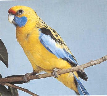Жълта розетаОписание: Големина 33 см. Мъжки: Сламеножълт, бузи, ръбовете на крилата и външните опашни пера сини, челна ивица червена, перата на гърба черни, обрамчени със светложълто. Женска: Глава и клюн по-малки, отколкото при мъжкия, червена челна ивица, често цветовете са по-слаби, отколкото при мъжкия. Малко: Дол на страна бледожълтозелена, подопашка масленозелена, горна страна масленозелена с малко черен рисунък, няма ивици по долните крила. Оцветяването завършва на 15-месечна възраст.