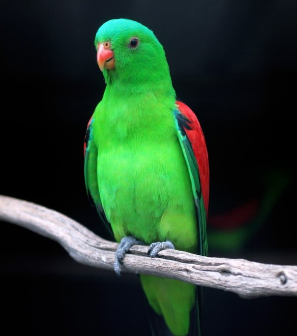 Описание: Големина 32 см. Мъжки: Листнозелен, гръб и рамене черни, крилата отгоре аленочервени, подопашка синя, ирис червенокафяв, клюн червеникав. Женска: Зелена, подопашка синя, крилата отгоре с малко червено по ръба, клюн розов. Малко: Като женската, но с черен ирис.